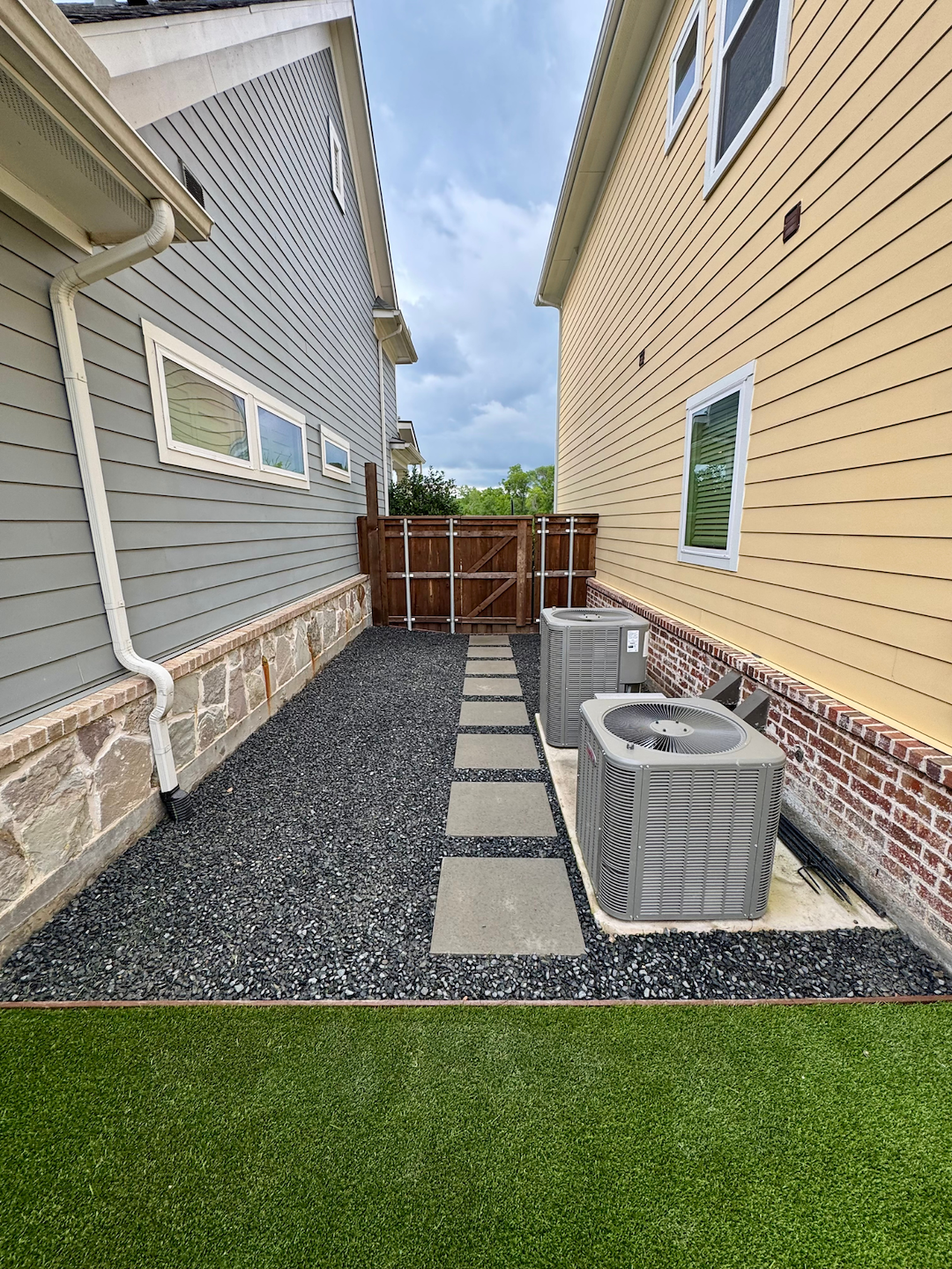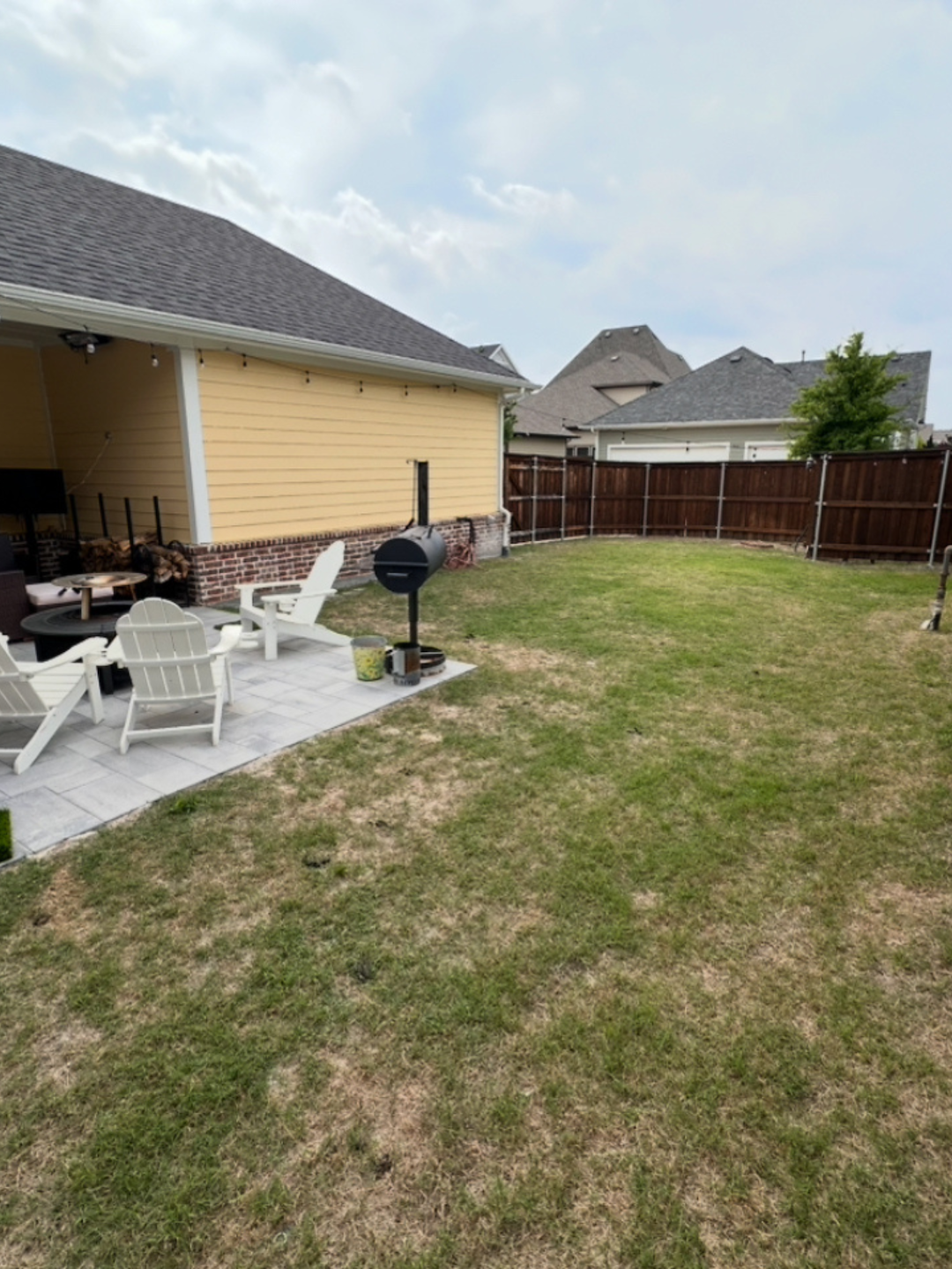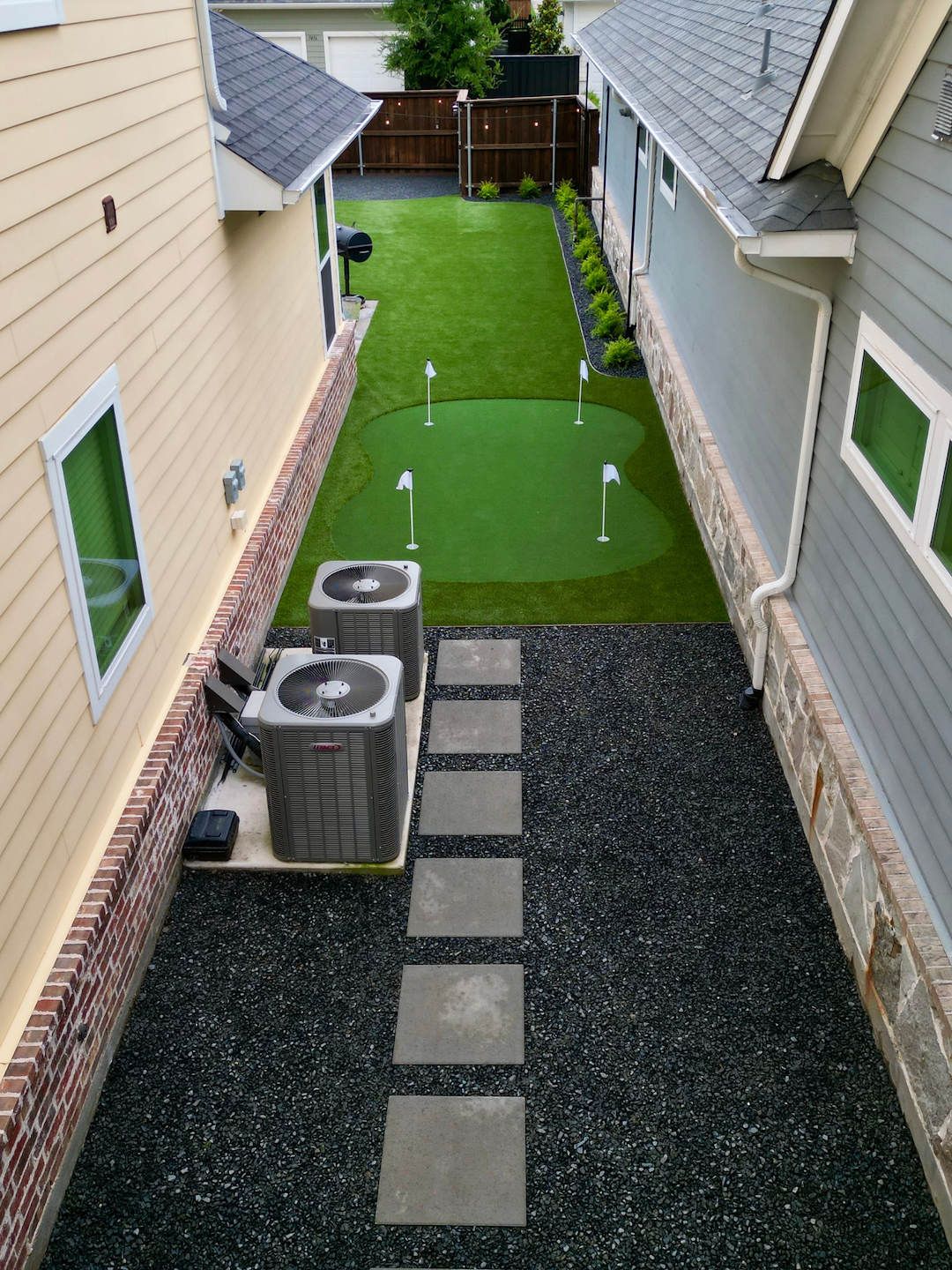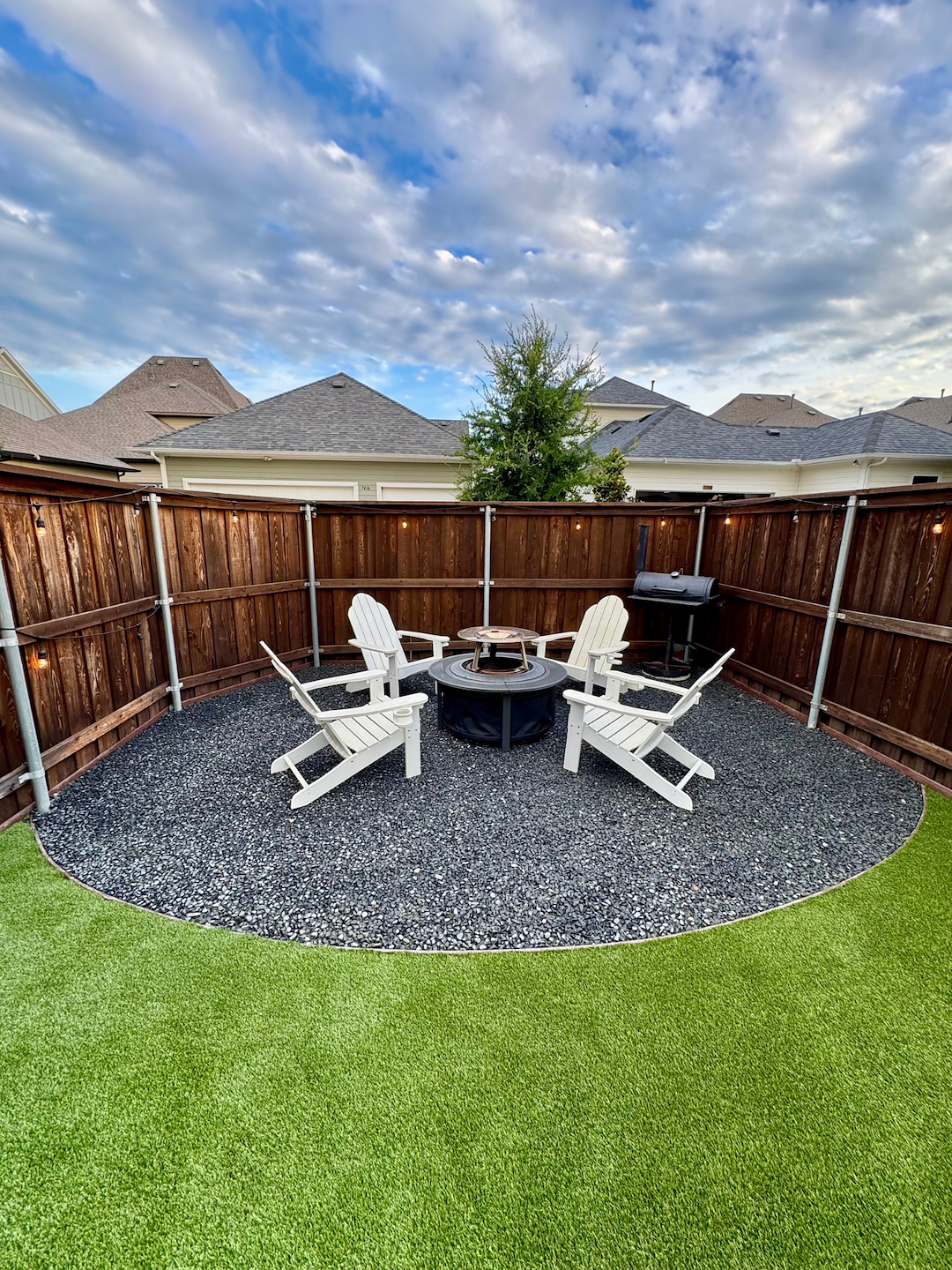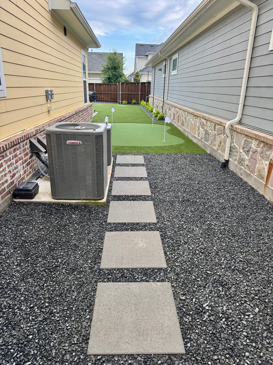 For this backyard redesign, we completely removed the existing grass and reimagined the space into a low-maintenance, multi-purpose outdoor retreat. The project features a landscape rock entry with a clean paver walkway, complemented by a decorative rock border lined with fresh shrubs for added greenery. At the back corner, we created a circular rock lounge area perfect for relaxing around the fire pit with friends and family. To bring in a fun and functional element, we installed a custom four-hole putting green, surrounded by premium artificial turf that now covers the entire yard. This new layout blends functionality, style, and play, turning the backyard into a year-round destination.