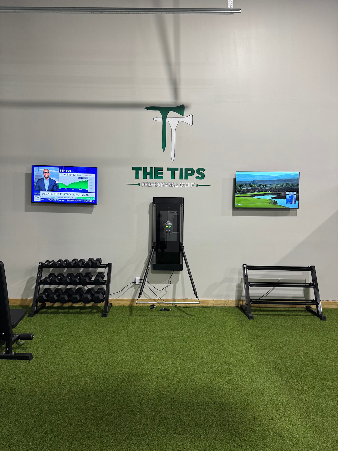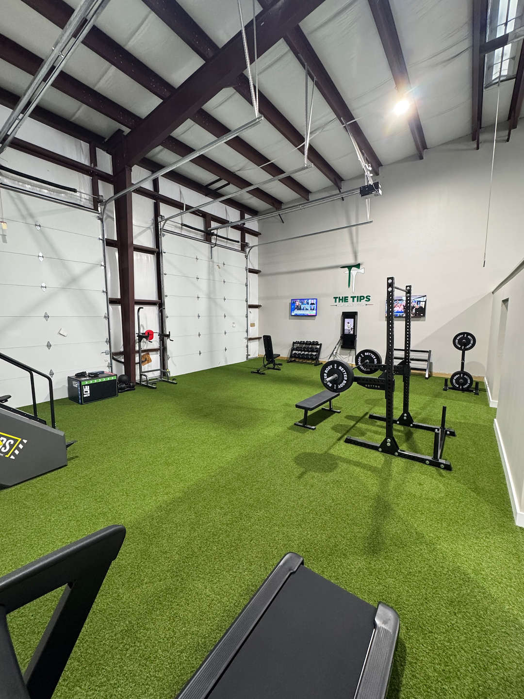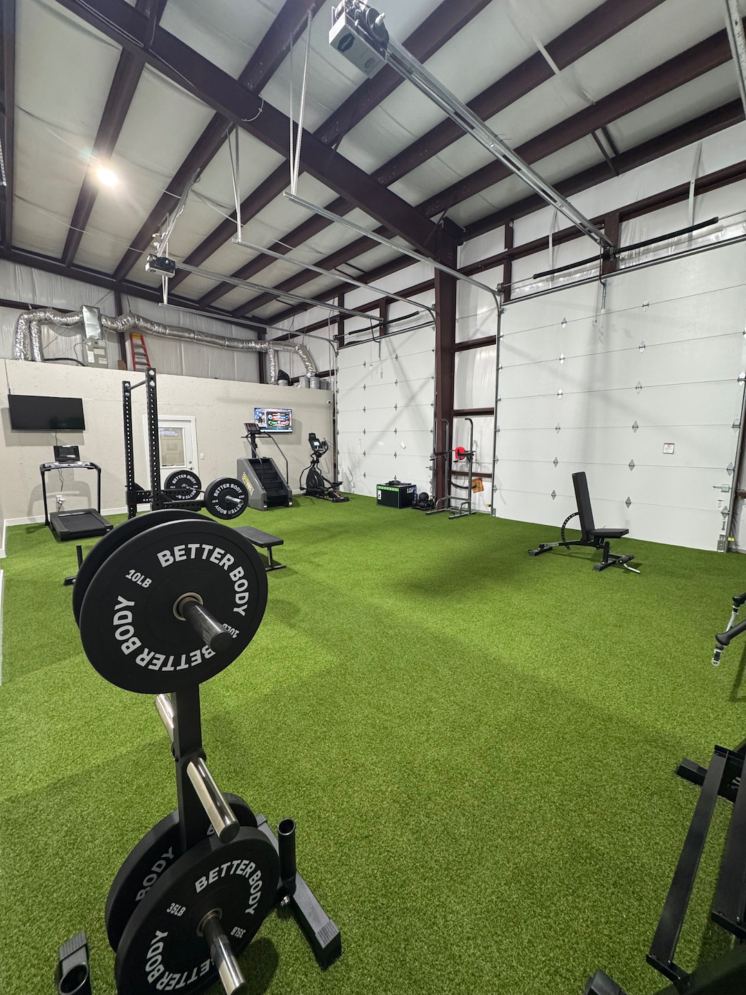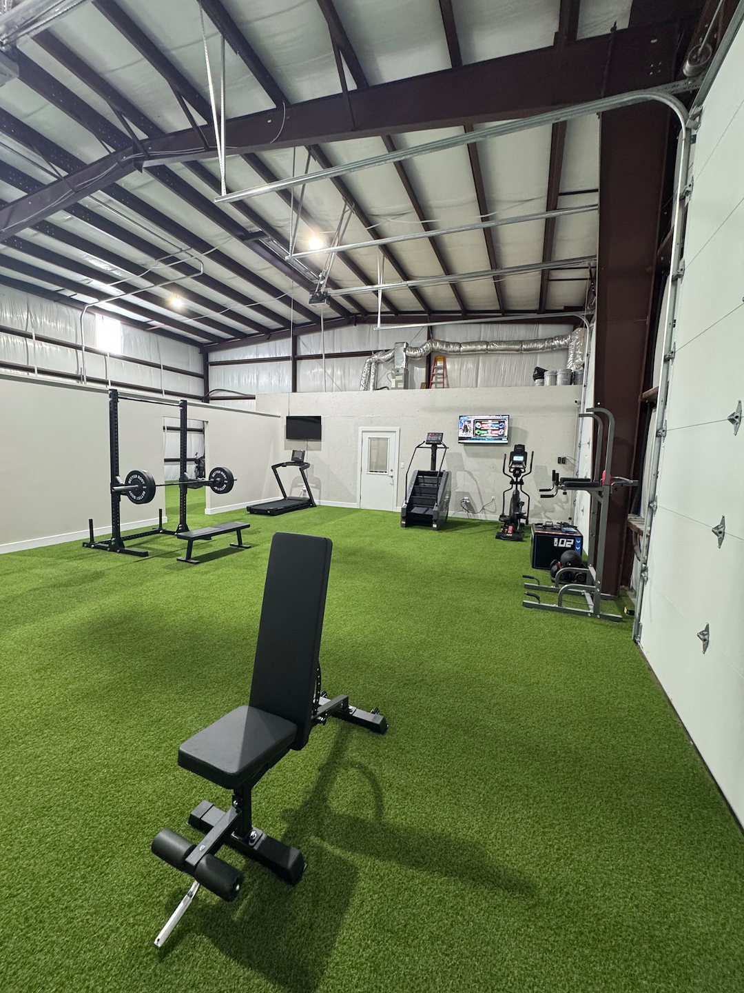 The finished space now operates as a membership-based gym featuring fitness equipment and a TrackMan golf simulator for lessons and year-round indoor training. Our durable, low-maintenance artificial turf provides consistent footing, shock absorption, and a clean, professional look throughout the facility.