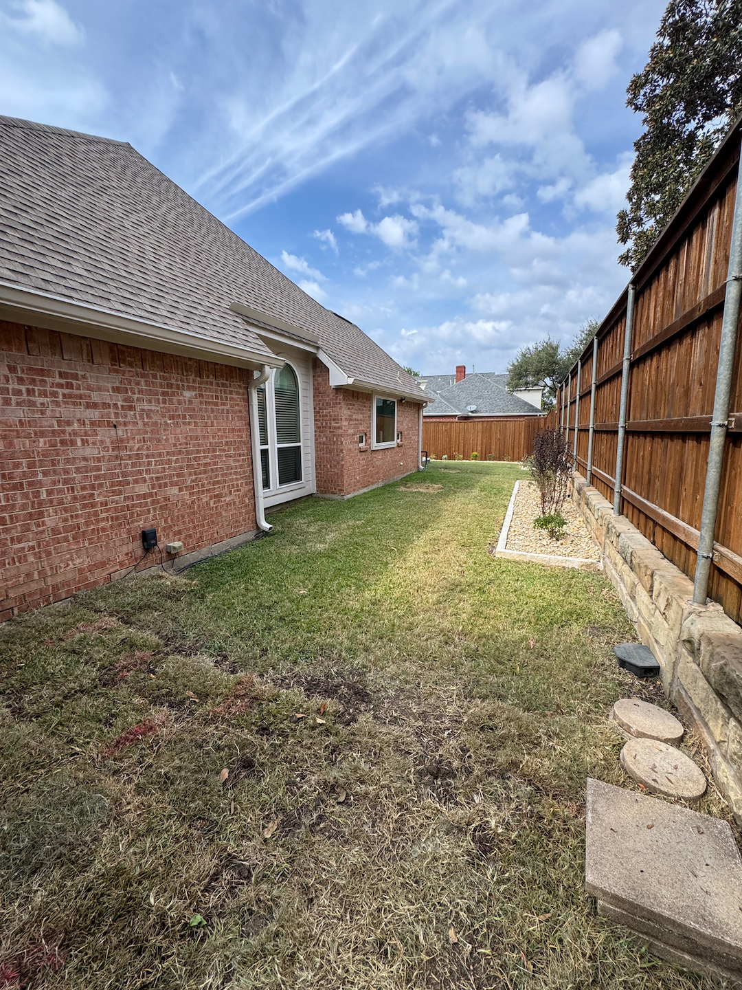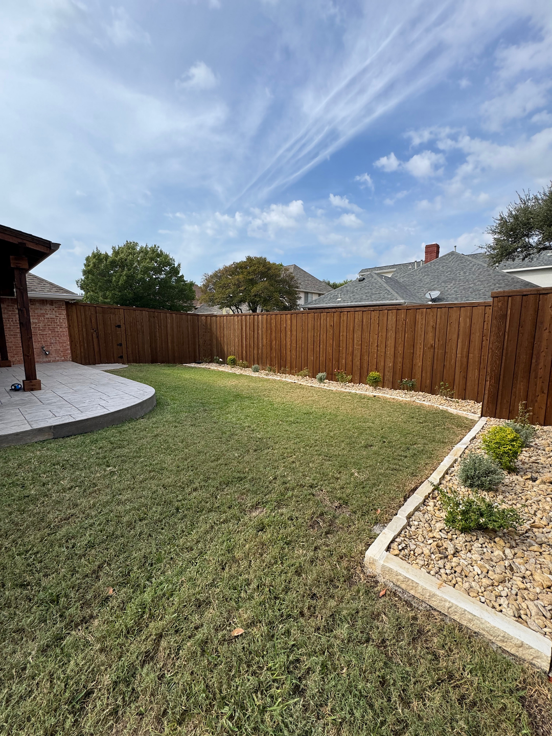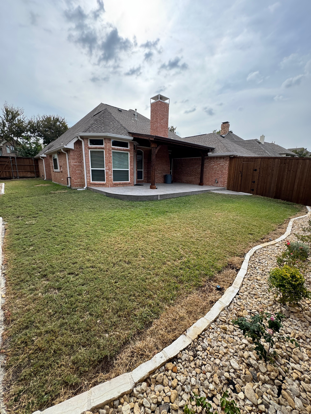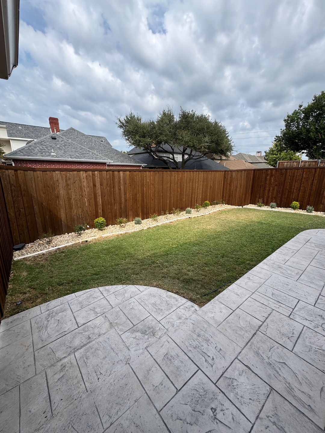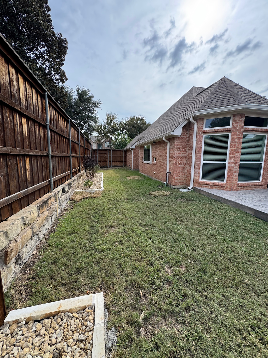 Our team began by removing all existing grass and preparing the entire backyard for a full landscape upgrade. We installed a custom paver walkway that leads from the side entry gate directly to the covered patio, creating a functional and visually appealing path through the yard.