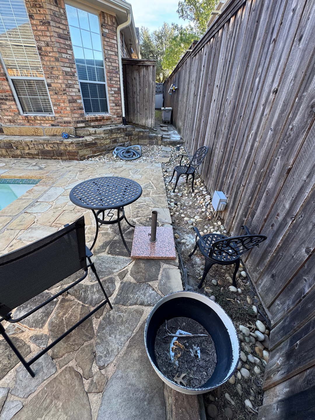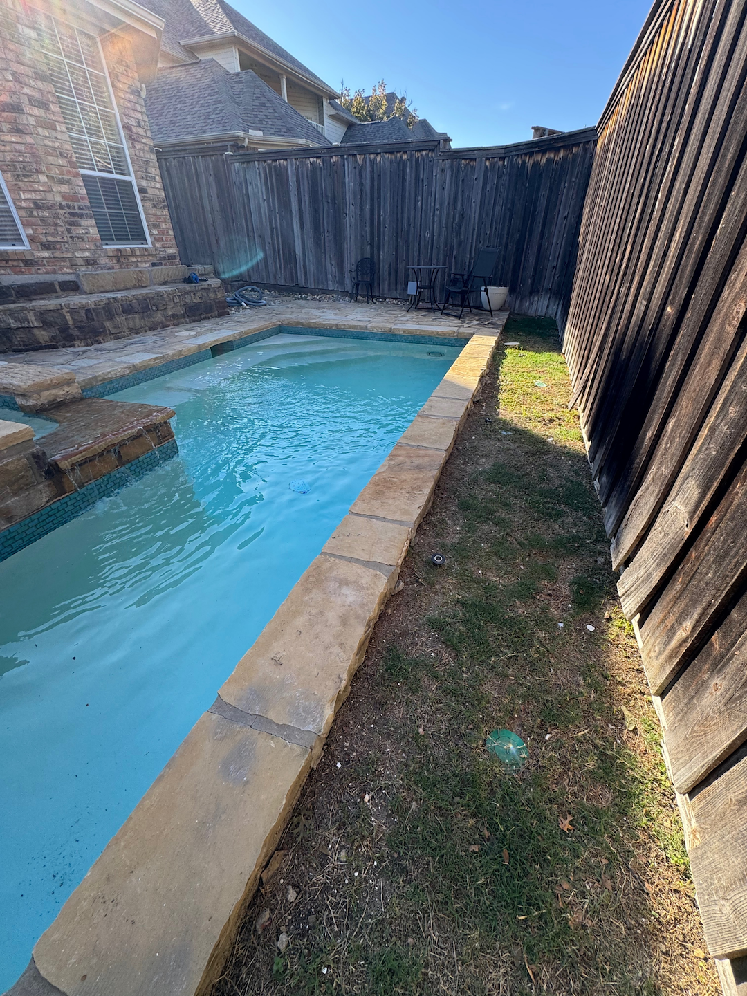 This project upgraded a narrow side yard and pool perimeter that previously struggled with poor grass growth, exposed dirt, and muddy conditions. The pool area was surrounded by loose rock and uneven surfaces, while the side yard had patchy grass and bare soil that created maintenance and drainage challenges.